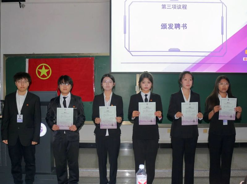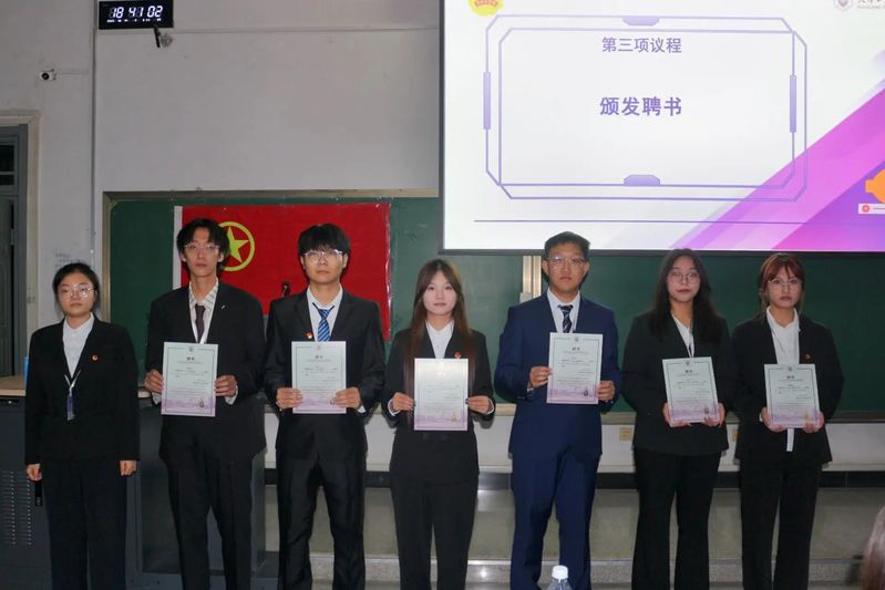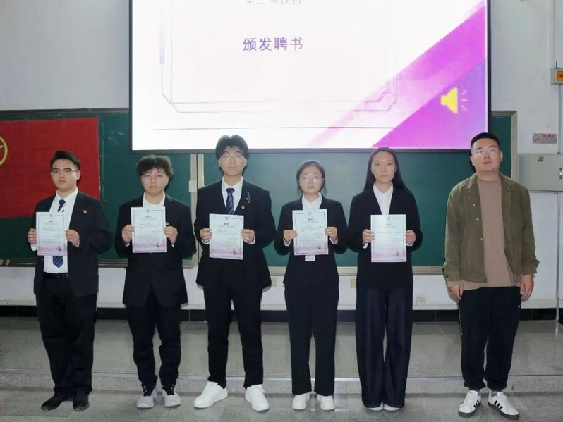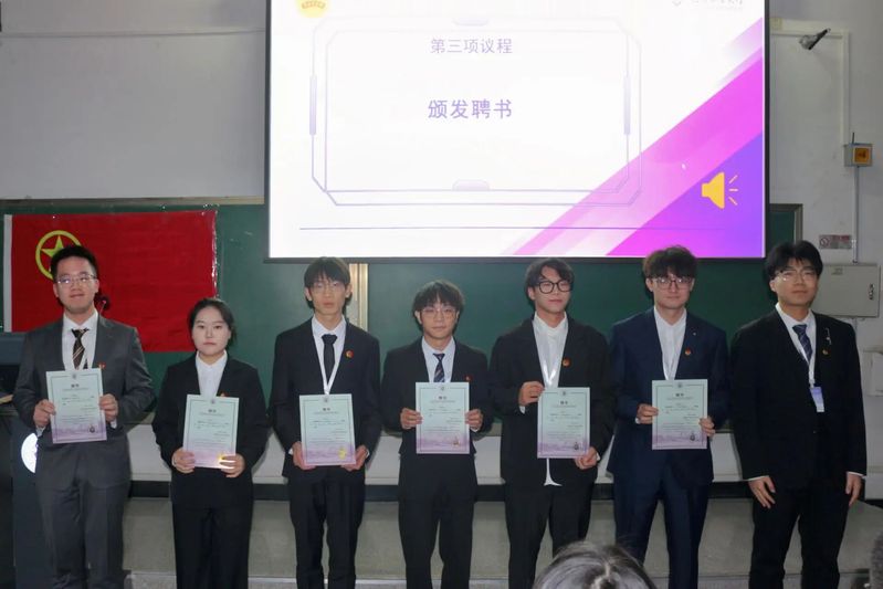 大会第三项,袁子杰老师为新一届主席团成员颁发聘书,随后又由主席团成员为各部门负责人颁发聘书。