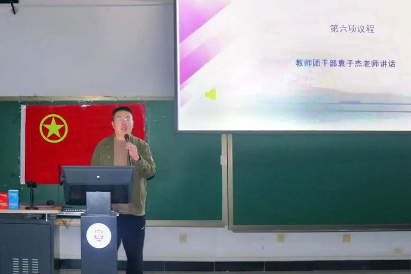 大会第六项,袁子杰老师进行教师寄语。他首先总结了上一届团委学生会的工作,随后强调了学生会工作的基础事项,袁子杰老师要求各部门要团结一心、砥砺前行,全体团委学生会成员要树立正确的工作态度,为同学们积极服务,促进个人综合素质进一步提高。