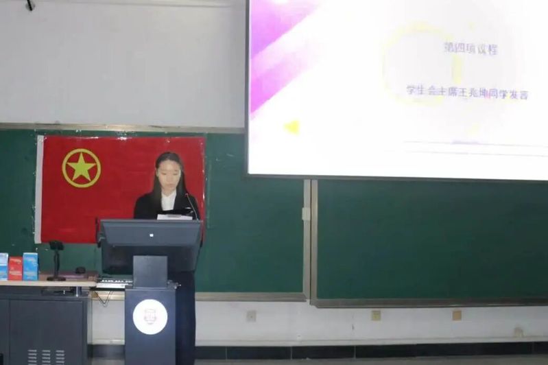 大会第四项,由团委学生会执行主席王兆坤进行发言。她以饱满的热情对学生会的组成进行了介绍,并对未来的学生会工作计划进行了说明。同时,她倡导同学们要发扬团结互助的精神,强调工作注重效率,各部门积极与其他部门交流、配合,为实现共同的目标而努力奋斗。