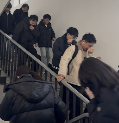 疏散演练环节模拟楼宇突发火情,消防控制室值班人员第一时间察觉险情,迅速启动应急疏散预案并拨打“119”报警。现场师生在工作人员指引下,以衣物掩住口鼻,弯腰贴近墙壁,沿预设最短路线快速有序撤离至楼外开阔区域,全程紧张有序、配合默契。与此同时,学校微型消防站队员火速奔赴火场,高效开展初期火情扑救工作,展现专业应急处置能力。